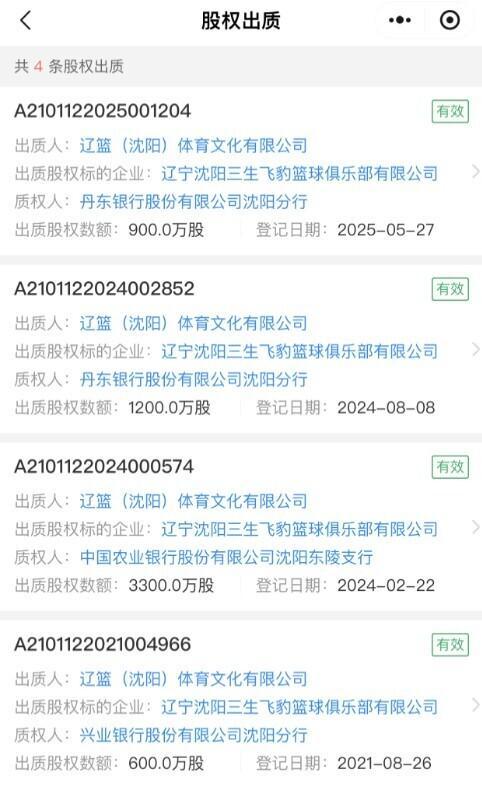 辽篮财政紧张不是新闻,此前就曾有“卖队”的传闻,坊间流传因为要求买方承担原有债务被拒,交易才告吹。而辽宁男篮俱乐部几次质押股权则是真事,公开信息时间和份额都能查到。