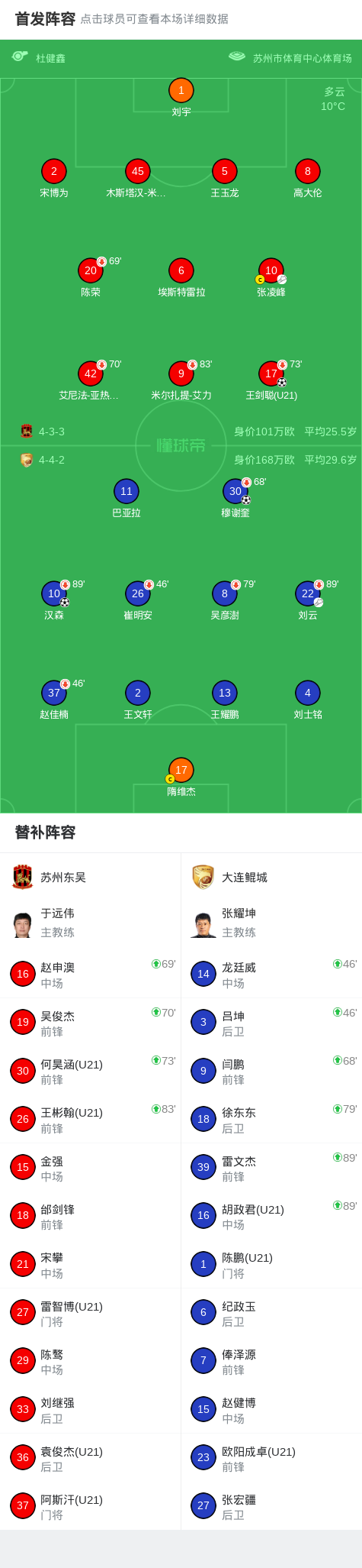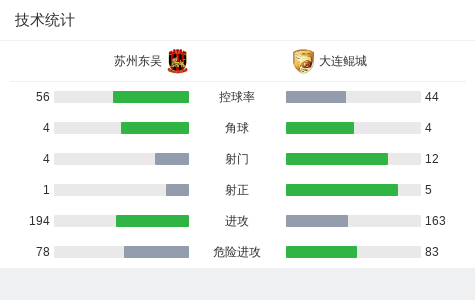 北京时间3月15日中国足球甲级联赛 联赛 第1轮,苏州东吴主场对阵大连鲲城。上半场,穆谢奎头球破门先拔头筹。下半场,王剑聪一脚世界波将比分扳平。仅1分钟过后,汉森一脚世界波破门还以颜色。最终,大连鲲城客场2-1战胜苏州东吴。